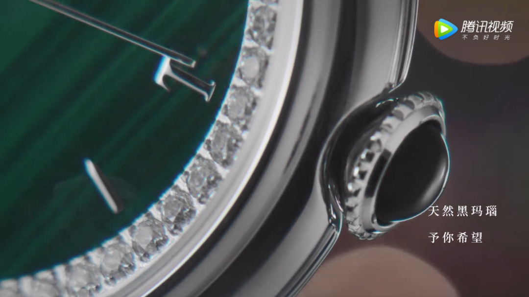 表冠上还镶嵌了一颗黑色的玛瑙,象征着希望,就如文案所写:“天然孔雀石,愿你幸运,天然黑玛瑙,予你希望”。