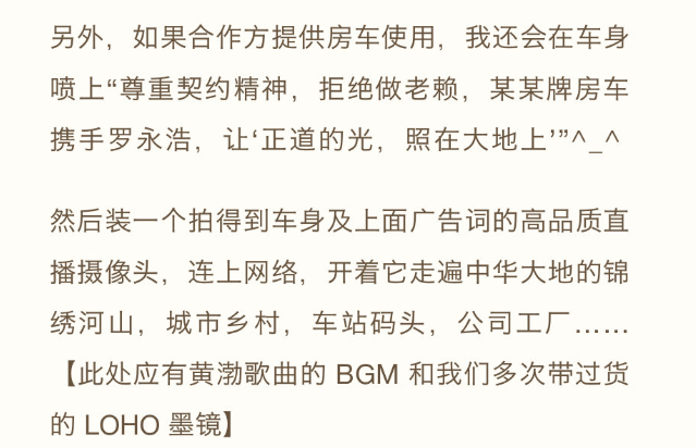 今年四月,罗永浩在微博发文称因他本人负债在身,出行受限,不能坐动车和高铁,因此向汽车厂商寻求房车赞助,文中列举了自己能为前者提供的利益,并称自己是“宠甲方狂魔”。