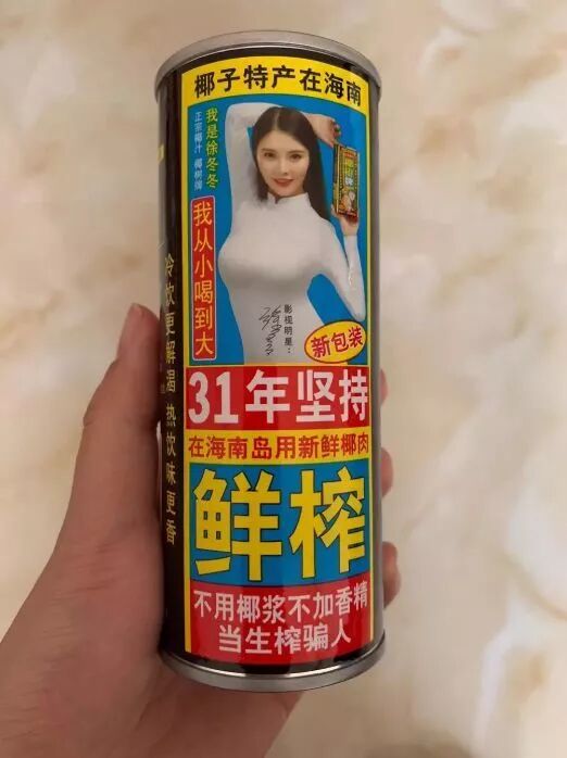 这个别扭的造型,还让人犯上了“反手拿椰汁造型症”。不过,比徐冬冬广告造型更迷惑的,还是椰树椰汁千年不改的包装。红黄蓝的三原色,蒙德里安的feel,有如贴满小广告的电线杆子。有着香港的霓虹灯广告格调,汲取了澳门赌场广告精华,还加入了日本小卡片的配方。