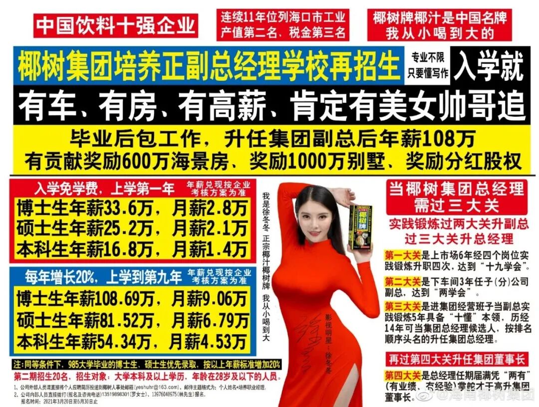 红蓝黑黄的配色,简单粗暴的文字,像极了街头骗子广告。emmm说得好听一点就是:椰中自有黄金屋,椰中自有颜如玉。看到这儿忍不住脑补画面:迎娶白富美、出任CEO、走上人生的巅峰。还有去年“椰树培养职业经理学校”的招聘,对应聘者提出两个承诺:哦对了,应聘者还得要写承诺书,承诺以房产作抵押,离开“椰树”以房产偿还。说到这儿,怎么不能再提提咱们的“椰汁女神”徐冬冬。