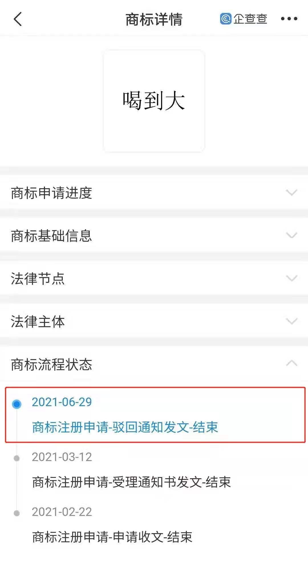 然而,最近有网友发现,“喝到大”商标流程状态变更为驳回通知发文,“从小”还在申请中。