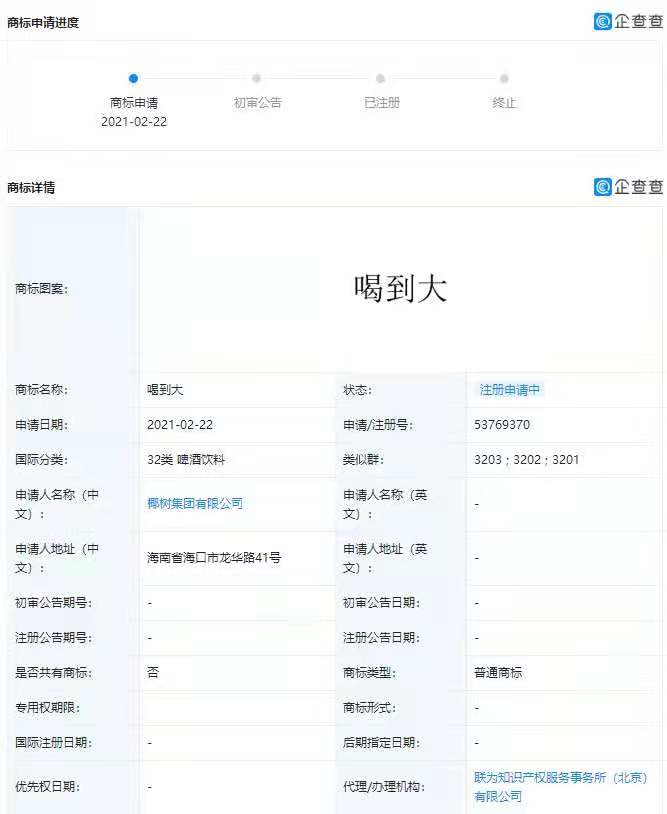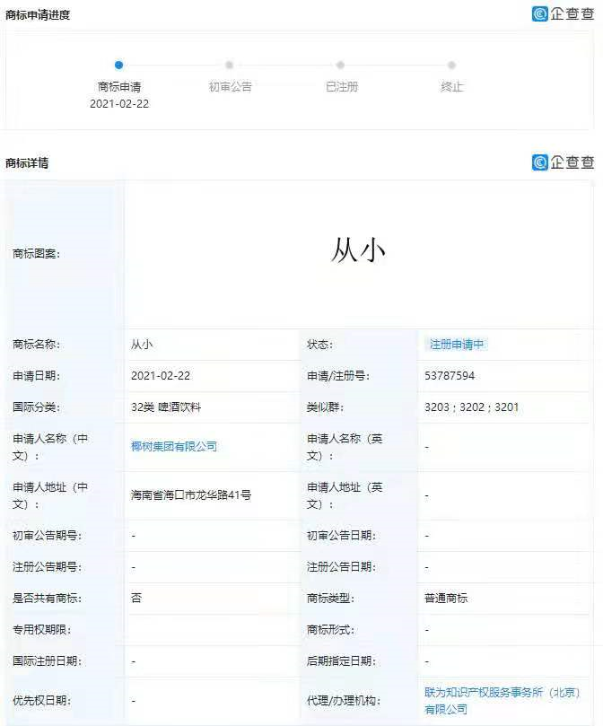 今年2月的时候,椰树椰汁申请了“喝到大”商标和“从小”商标,灵感就是来自“从小喝到大”。