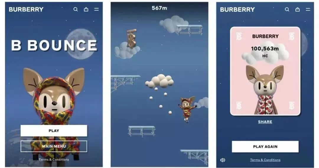 Burberry曾在其官网上推出《弹跳小鹿》小游戏,高分玩家可以赢得小鹿同款羽绒夹克,相当具有诱惑力。