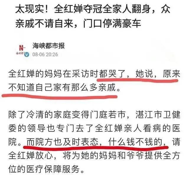 夺冠后,全红婵家大院前停满汽车,各方来路不明的祝贺电话几天不断。有远房亲戚跑到全红婵家里认亲,还有人拿着医药箱给她妈妈看病。全红婵的妈妈不停地跟各路来探访的“亲友”合照。她感叹说,嫁过去那么久,第一次知道家里有这么多亲戚。