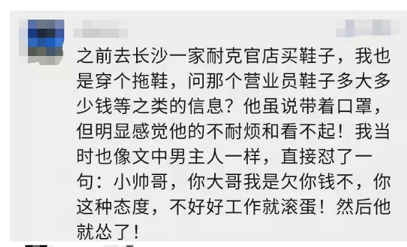 更过分的是,事后毛先生打耐克客服热线让公开道歉却无果,事件过去一周后,此事被媒体和大众关注和讨论后,迫于舆论压力,耐克才公开道歉,可见态度很是敷衍。这并非个例,事件发生后,不少网友纷纷在网上分享在耐克消费被歧视的经历。