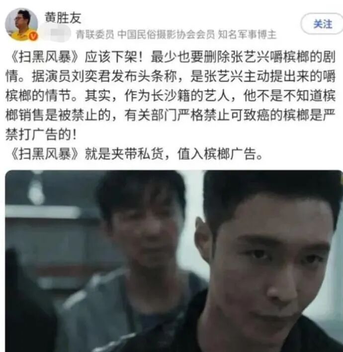 在黄胜友看来,张艺兴主动提出咀嚼槟榔的情节设计很不合理。因为作为长沙籍艺人,他应该知道,有关部门严格禁止槟榔打广告。黄胜友认为,这就是《扫黑风暴》植入槟榔广告“夹带私货”,建议下架。02