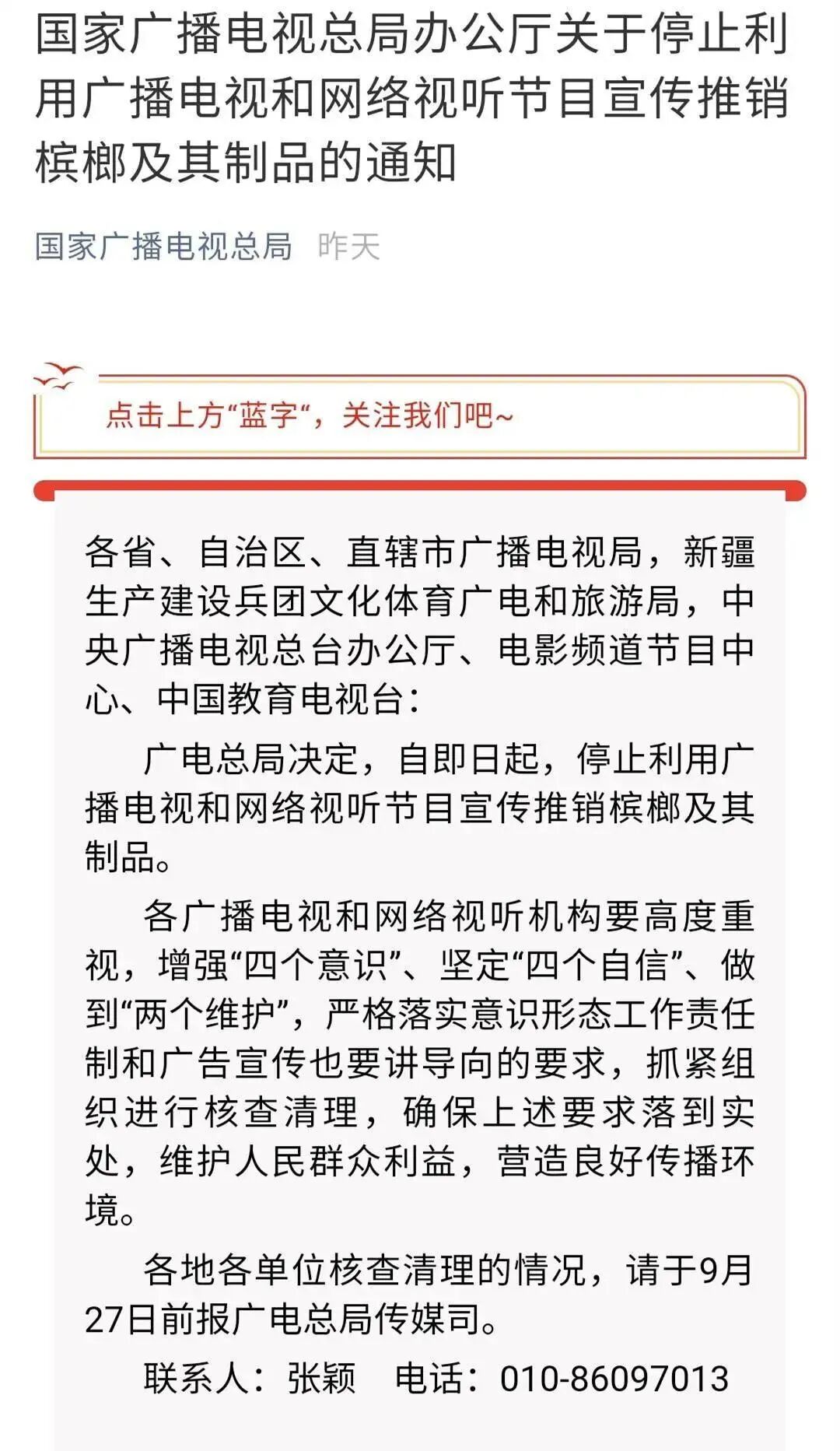 9月18日,广播电视总局办公厅发布了一则关于停止利用广播电视和网络视听节目,宣传推销槟榔及其制品的通知。