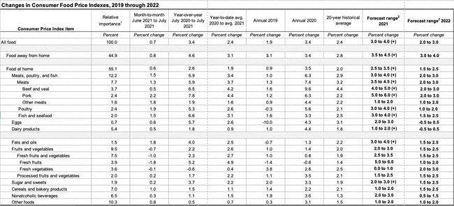 鸡蛋、牛奶、零食等家庭食品的平均价格上涨了1.9%,全年的鱼类和海鲜类产品价格将上涨3.0% 至 4.0%,所有食品的CPI平均上涨2.4%。根据预测,2021年全年,家庭食物的价格预计将上涨 2.5% 至 3.5%,外卖食物的价格预计将上涨 3.5% 至 4.5%。