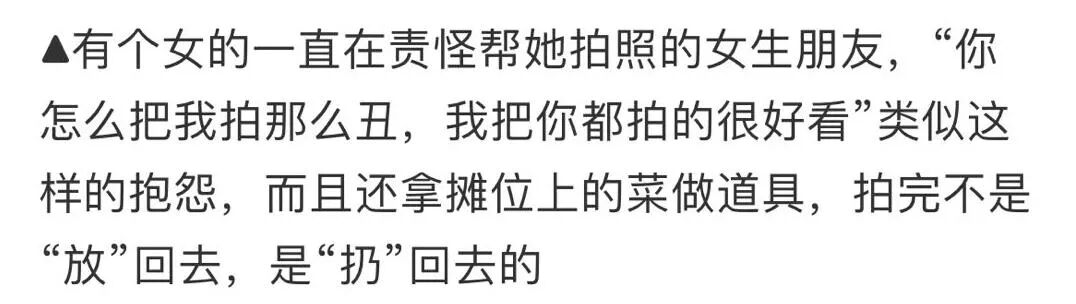 又比如,有人不买东西霸摊位拍广告,有的拍完照就把菜丢回去;有的堵马路上录直播,只为那张印有“Feels like Prada”字眼的照片。