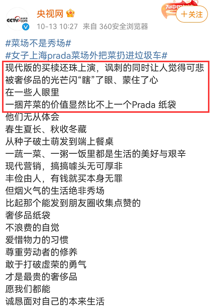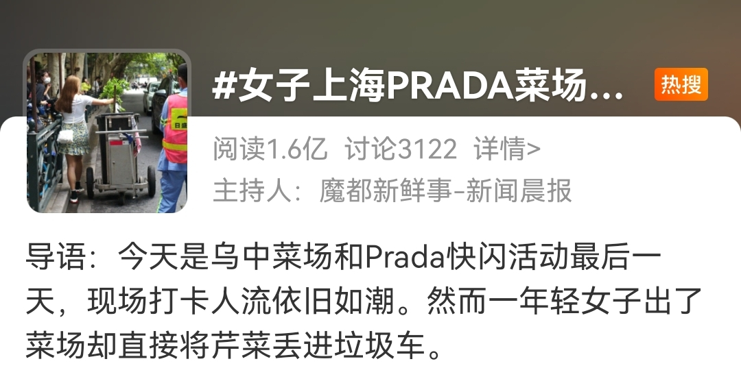 前两天,一条#女子上海Prada菜场外把菜扔进垃圾车#话题冲上热搜,一不小心又给咱们科普全新名媛概念。