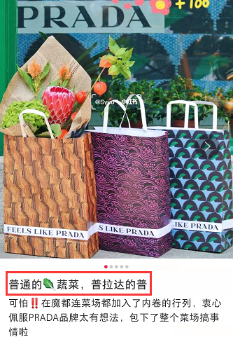 虽说Prada菜市场提供给网红炫耀的“单品”,就是个简单的购物袋。但此刻的Prada购物袋,就是网红标榜身份的消费符号。