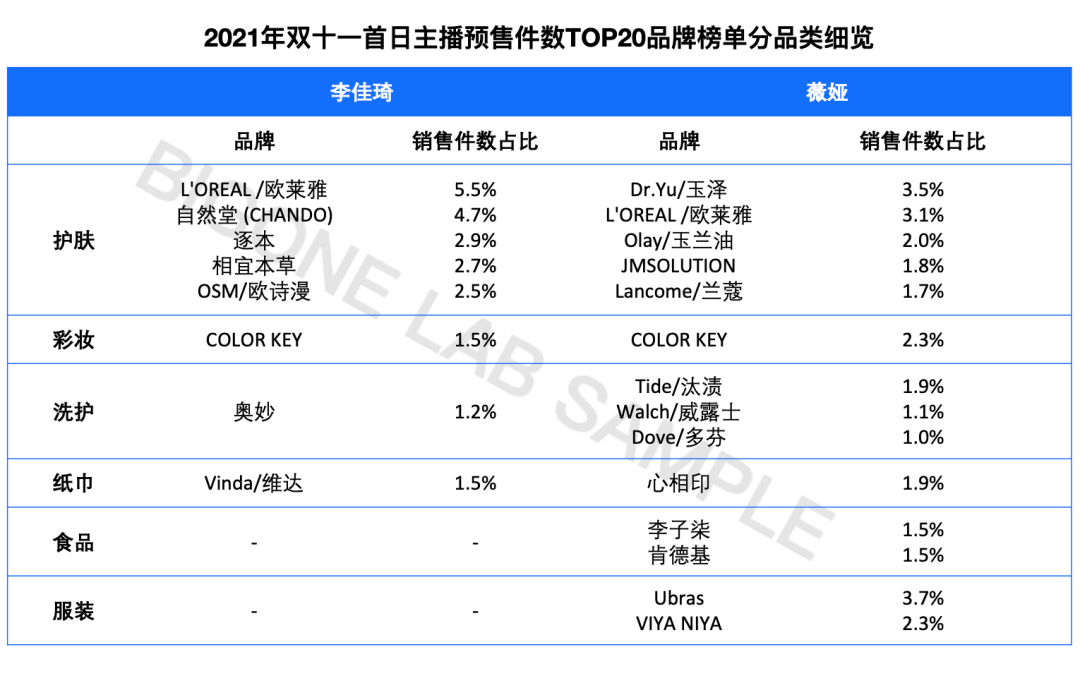 看一下今年双十一直播的相关数据,李佳琦直播间的品牌榜单中,欧莱雅稳坐头把交椅,首日预售234万+件,其次是自然堂、逐本、相宜本草、欧诗漫…而爆款单品,自然堂、逐本、优时颜三大国货新品牌以价低量多取胜。薇娅直播间销售品类覆盖更全面,玉泽、欧莱雅、玉兰油、Colorkey、ubras、李子柒等品牌居前列。