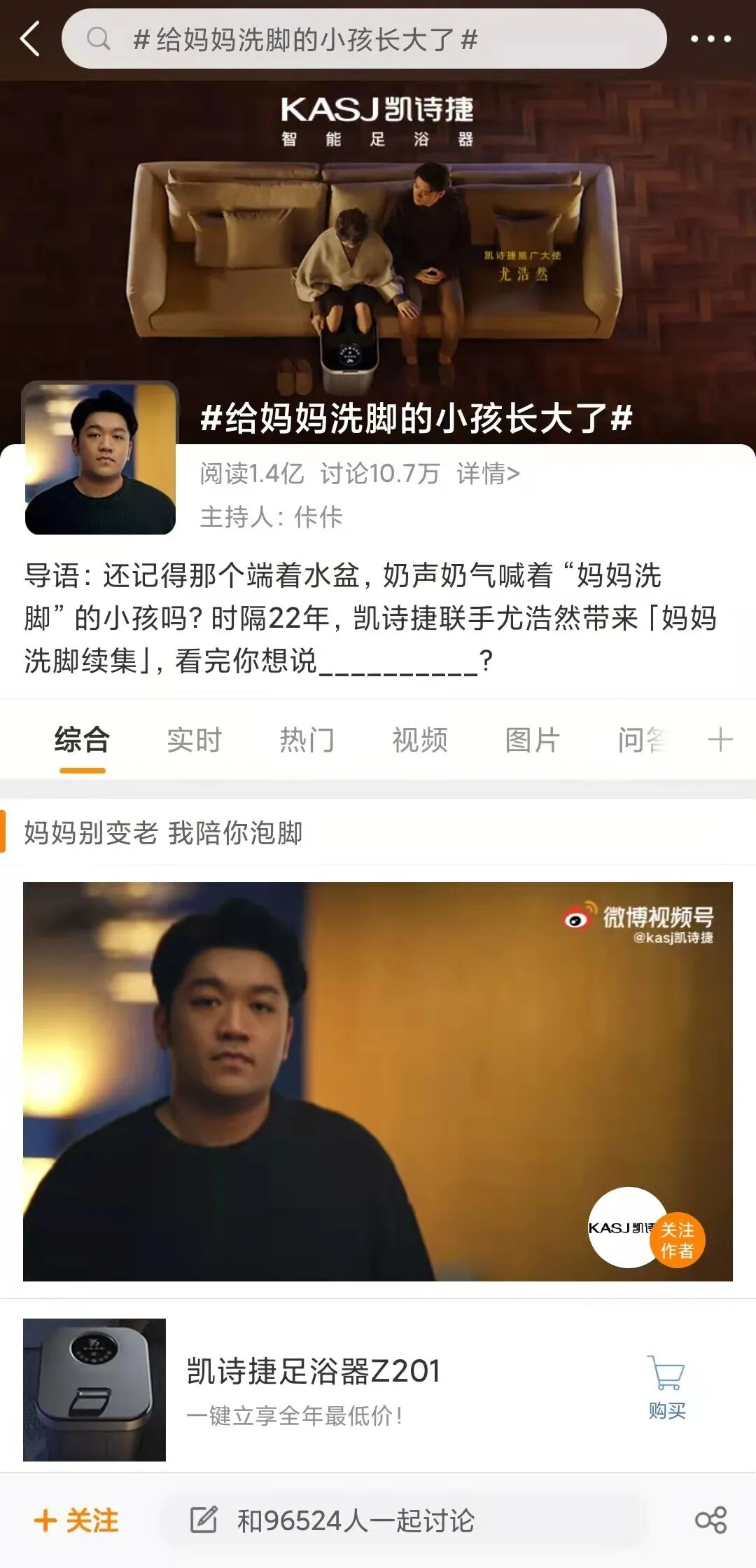 而时隔22年后,凯诗捷竟然找来了当年那个奶声奶气喊着给“妈妈洗脚”的小孩——尤浩然,带来《妈妈洗脚》续集——《给妈妈洗脚的小孩长大了》,不但再次感动亿万网友,给品牌带来了更多的声量,更为品牌注入了一股浓浓的温情。