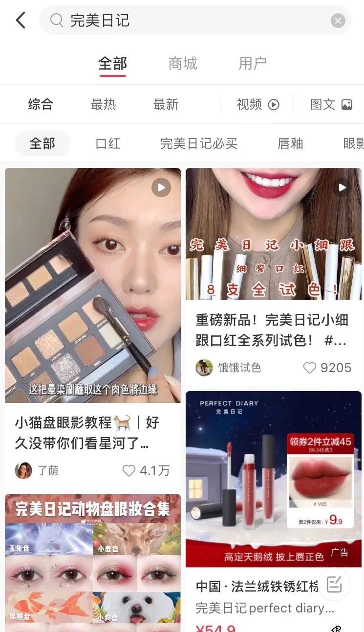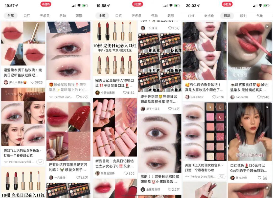 如果你在小红书上搜索“完美日记”,会看到超过30万篇笔记。设想一下,无论翻了多少页,看到的基本都是“恰了完美日记饭”的博主推荐。