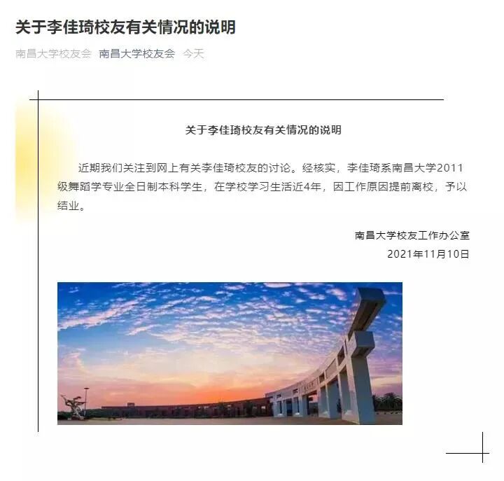 最新回应(深燃综合公开报道):11月10日,南昌大学校友官方微信号发布说明回应李佳琦学历情况,称其因工作原因提前离校,已予以结业。