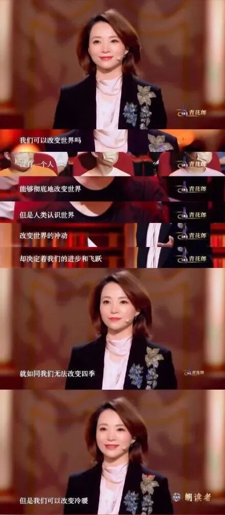 董卿说:“朗读者就是朗读的人,在我看来可以分为两部分来理解,朗读是传播文字,而人则是展现生命,将值得尊重的生命和值得关注的文字完美结合,就是我们的《朗读者》。“