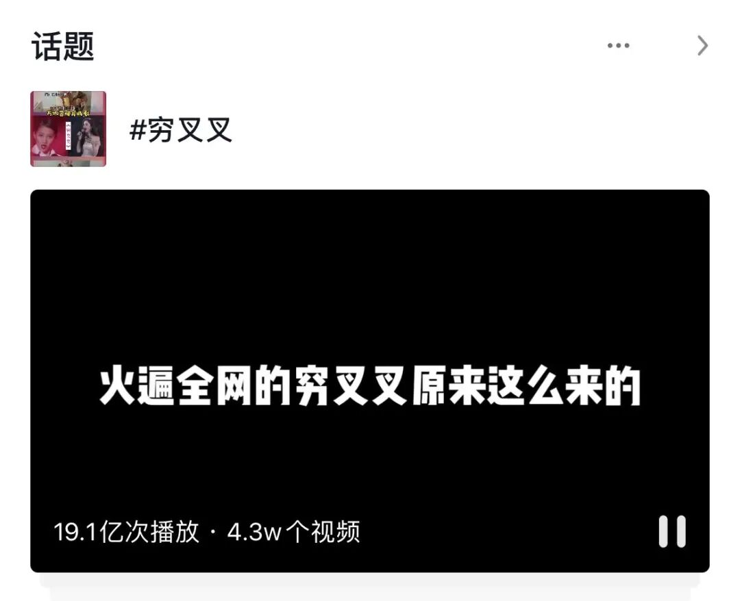 一番发酵下来,《穷叉叉》成功荣登2021洗脑神曲宝座,甚至有数据称其“一夜被播7亿次”。只是对官官来说,几亿几亿都不重要,重要的是,写完今天推送的我,就算喝上十八碗的孟婆汤,也不一定能忘记穷哈哈的尾调和哈利波特骑着扫帚飞的想象了......什么明星社死瞬间,只要玩得好,都是流量“整活”密码。