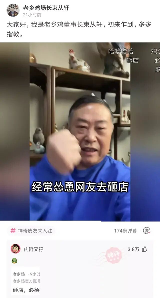 还有一只更猛的鸡——皮皮鸡,身为老乡鸡的皮皮虾官方光明正大的“怂恿”网友们去砸店,结果被董事长束从轩亲自跑到皮友村逮了个正着。
