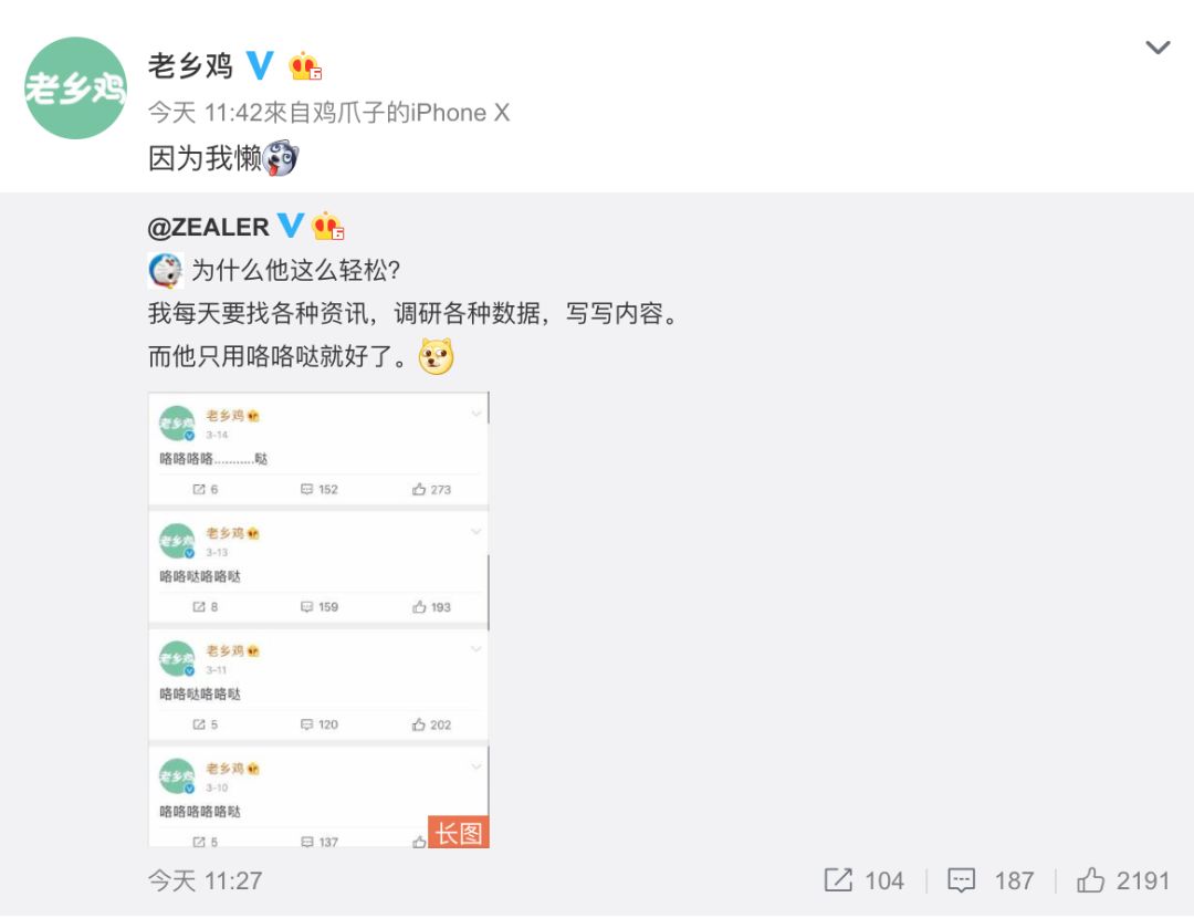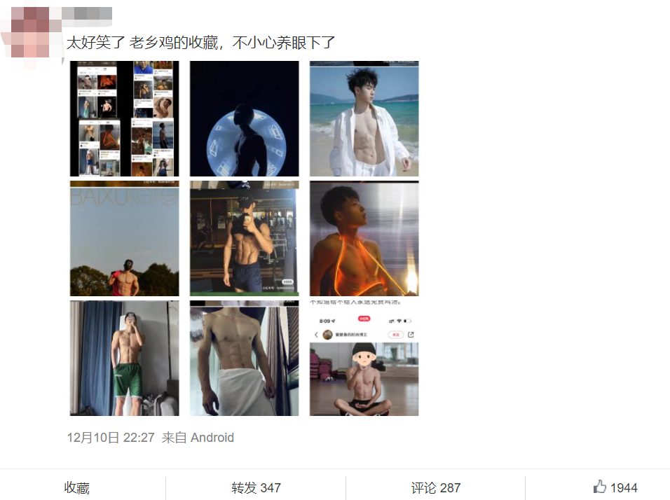 用一堆美男吸引关注,打造这种色(不是)鹤立鸡群,在一众官博中脱颖而出的鸡设;中间再时不时夹杂着自家董事长的美照,营造巨大反差与趣味感,凸显董事长又懵又萌的可爱气质这里插一句:还有人发现老乡鸡的“标记”一列大多都是美女: