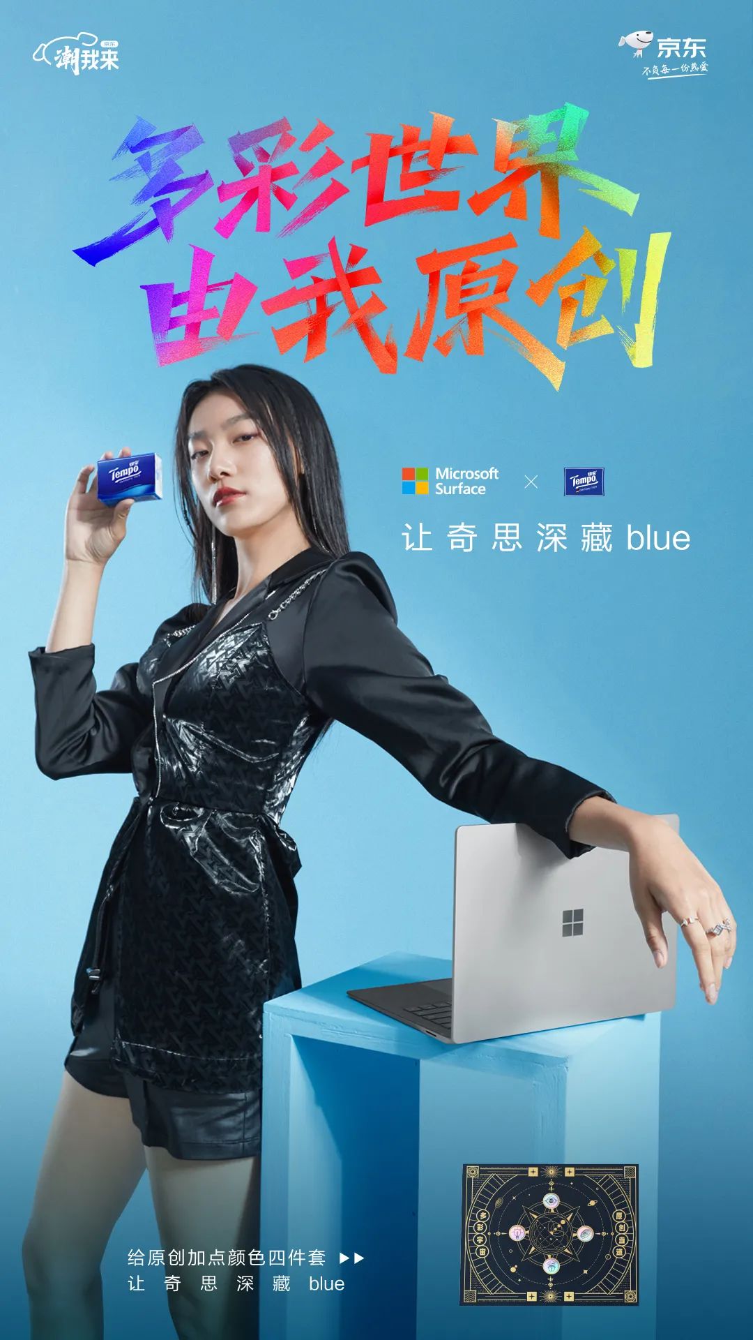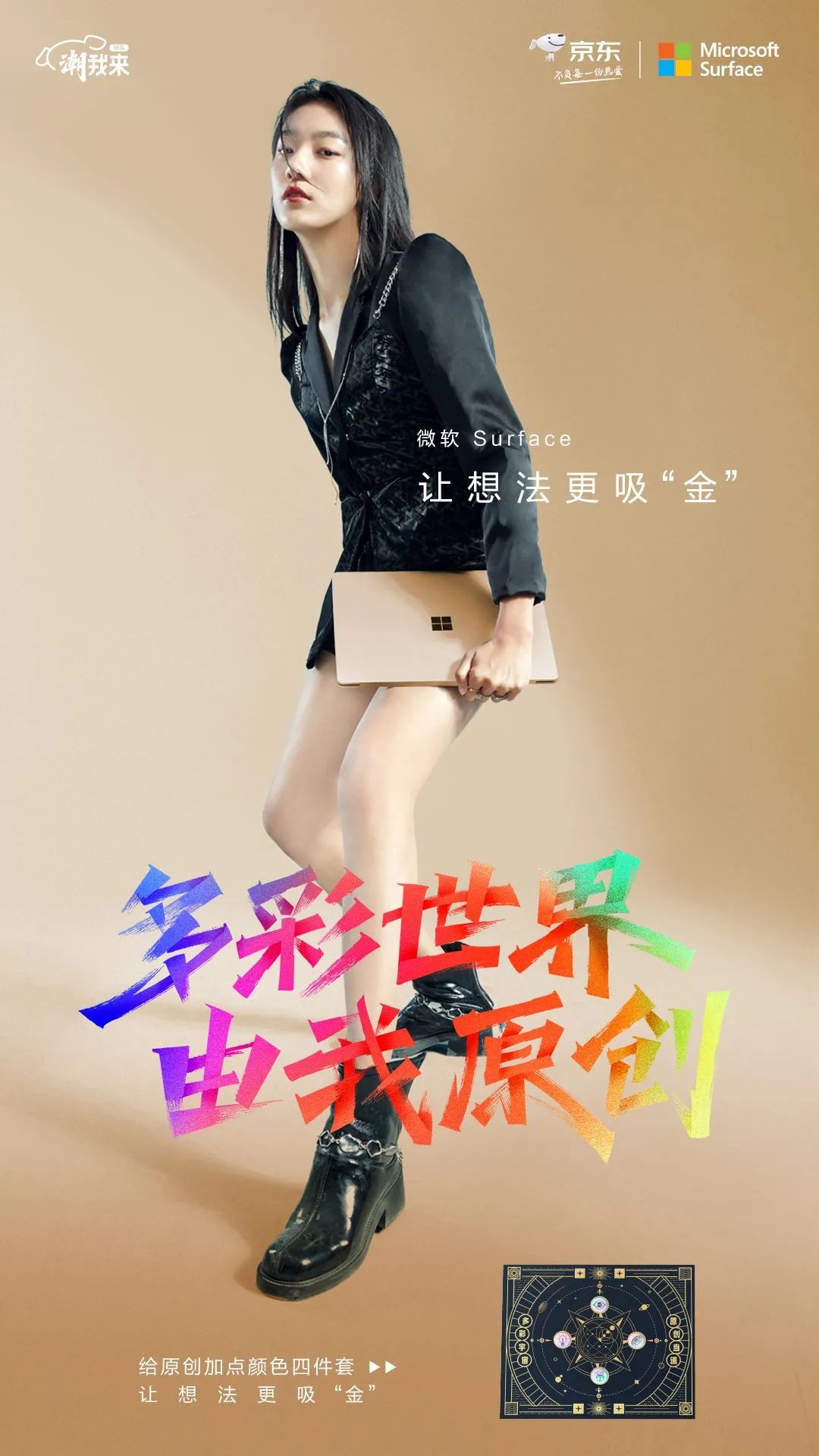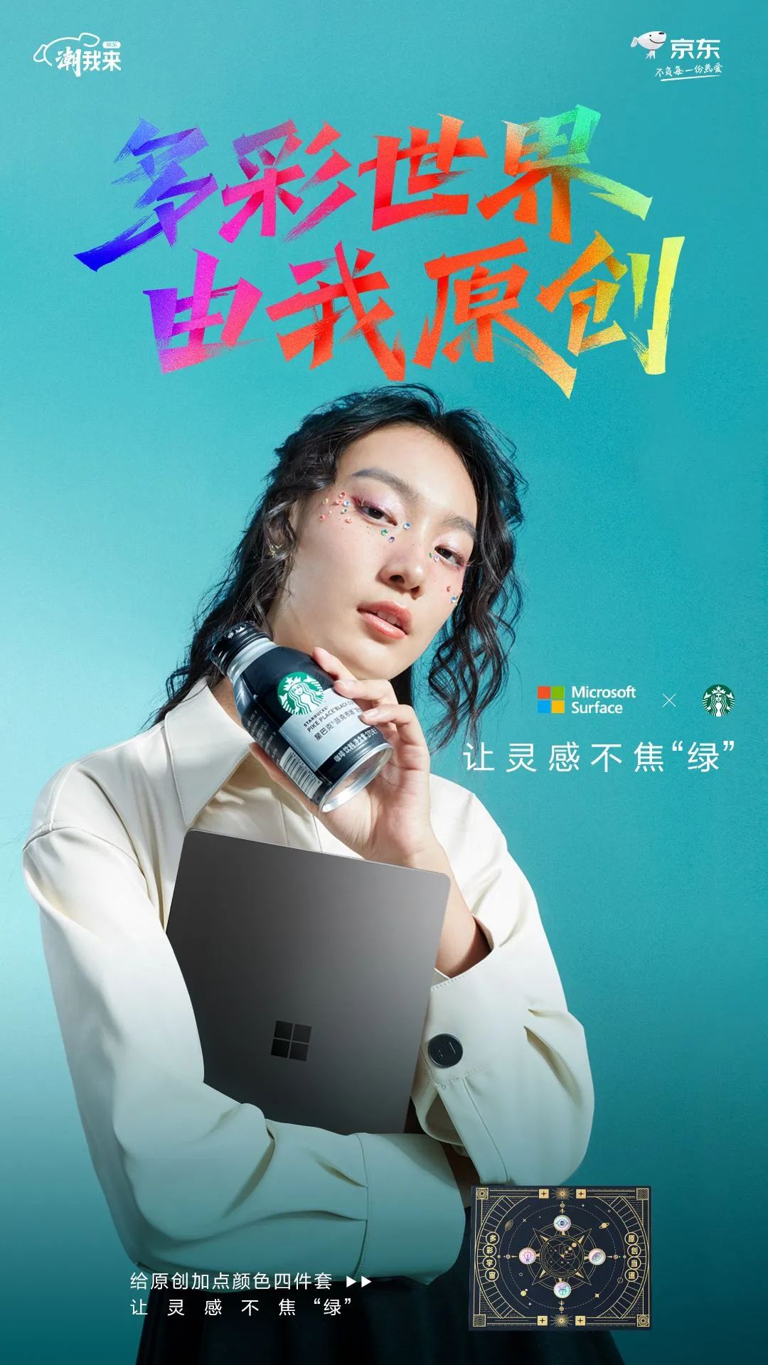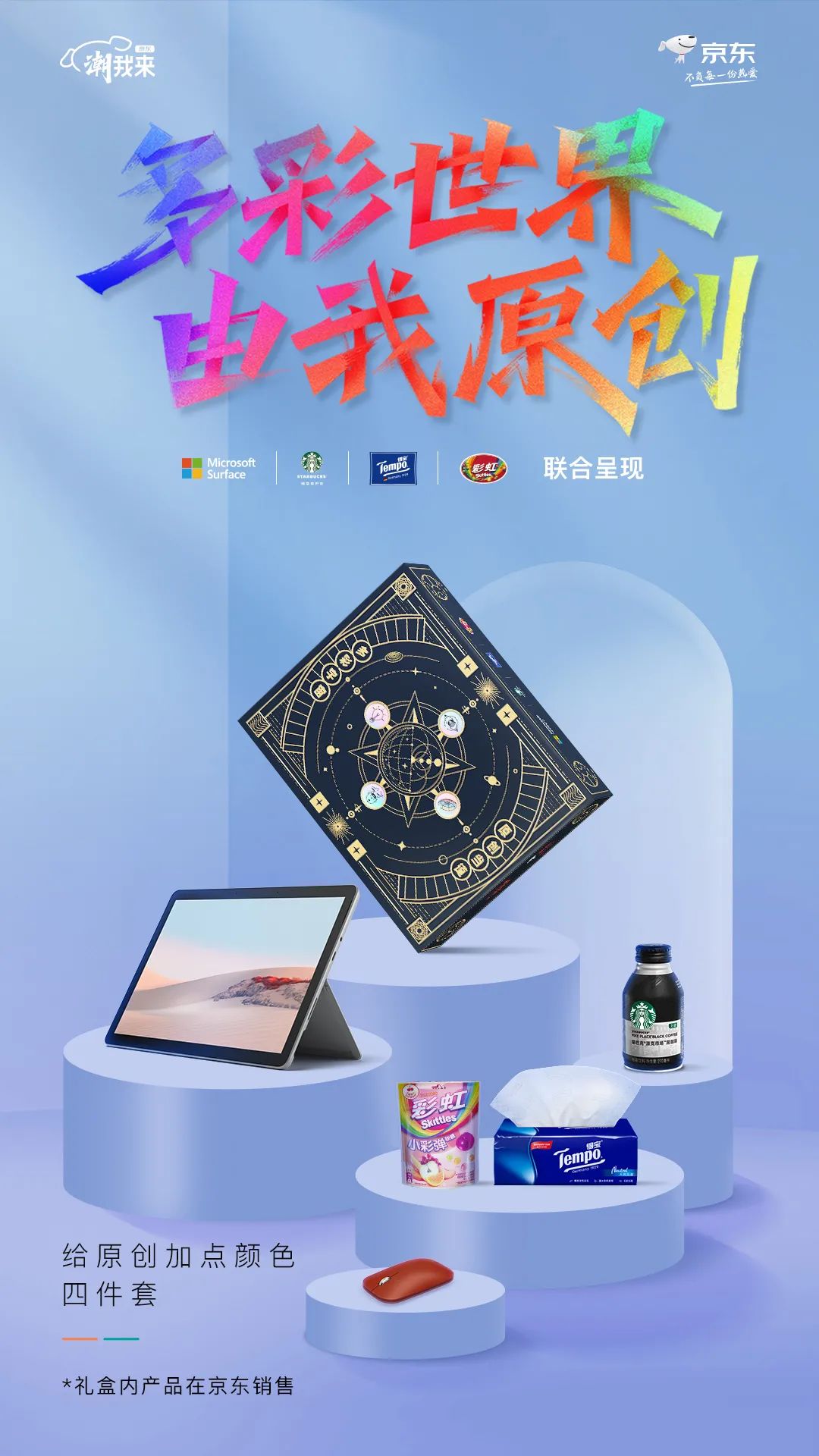 而在京东电脑数码的牵线下,微软Surface、星巴克、彩虹糖、及得宝四大品牌还进行跨界合作,以「原创」为内核精神,打造了“给原创加点颜色”四件套联名礼盒,同时拍摄跨品写真时尚大片,使整体传播调性都显得年轻时尚。