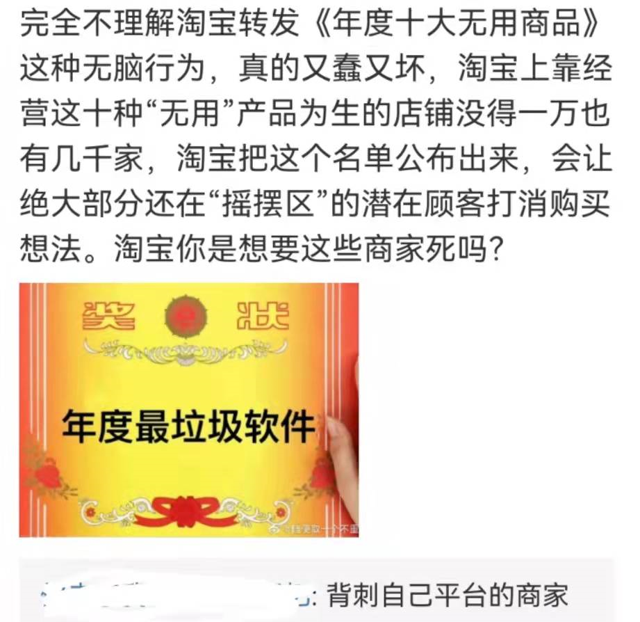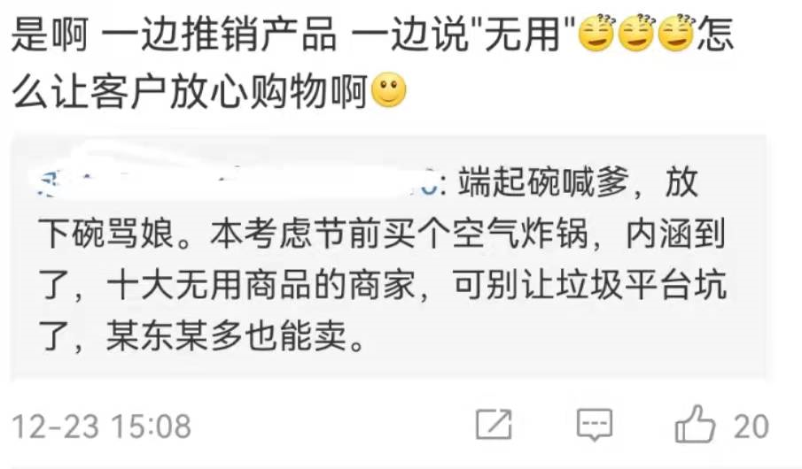 于是围绕这个话题,大家关注的点分别是:为什么删博,空气炸锅为什么在榜,那几位塌房明星到底是谁?精选君看了一圈网友的讨论,以及结合咸鱼淘宝的市场行情来看,淘宝删博大概有以下几点原因:且先不说空气炸锅、筋膜枪这些小家电(除了跑步机,虽然是大家电属但这上榜真不冤,有的时候在家用跑步机真的需要毅力.......),到底应不应该在榜上的问题。借着疫情,一大批小家电凭着“宅经济”,开始在电商直播里发光发热。根据数据显示,今年上半年,小家电的整体零售额突破250亿,销售量达1.19亿台。当淘宝商家打着“小家电提高幸福感”的口号,开始以颜值、懒人必备、高性价比居家好物等攻势向消费者安利小家电,瓜分细分市场领域里的一块大头时,咸鱼却爆了小家电“无用”的雷。于是,还没到跨年晚会,在淘宝一手买的东西,咸鱼二手卖的剧场上,便上演了一出自家兄弟内爆,自己再添一把火的好戏。强烈建议将今年感动网友奖杯奖给咸鱼,正当大家都在猛烈抨击告密者的时候,只有咸鱼发挥了大无畏的人道主义精神,逆流而上,奋勇前进,奋力向前,跳过告密,直接自爆,简直让老罗直呼内行。咸鱼格局在大气层