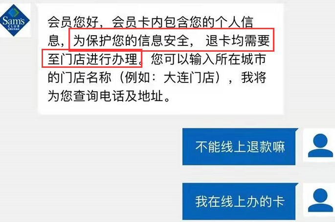 无论是网友晒的会员卡退卡记录单,还是山姆服务助手的聊天记录,都会发现山姆特地划了个重点: