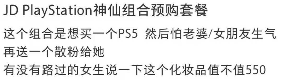 乍一看还是有点懵的,化妆品和游戏机可以说是风牛马不相及了,面对的群体也不一致。一般赠品都是同类的内容,这对于女性购买者有啥吸引力?一个三位数,一个四位数,这下知道哪一个是买的,哪一个是送的了吧?这浪漫跨界,捆绑销售的手法,可以说是画风清奇,直接拿捏了男性同志们买游戏机怕老婆生气的现实痛点,被网友形象地称为:甚至贴心的帮男同胞们想出了两个家庭内部沟通方案——02