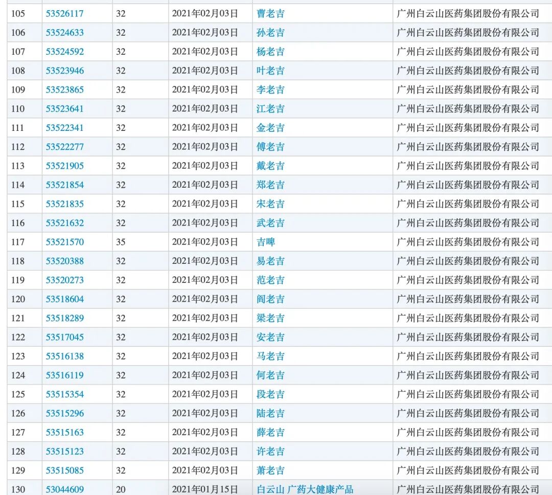 据王老吉解释:本次王老吉姓氏图腾罐活动共提供 115个姓氏图腾产品, 姓氏图腾来源是根据王大有先生著作 《中华姓氏图腾始原》中现有图腾创作,部分姓氏没有这是因为商标注册等原因,使得其他部分姓氏未能生产发售。像张、刘、徐、吴老吉的商标就被注册了。其实王老吉推出百家姓定制罐,不止“广告营销”那么简单,这背后是海量的商标储备战。在去年年初的时候,王老吉就已经在布局这场营销了,王老吉关联公司广州白云山医药集团股份有限公司此前已经申请了多个“老吉”系列商标,包括毛老吉、丁老吉、赵老吉、李老吉、苏老吉、白老吉等100个商标,这些商标申请并非都是30类凉茶商品,还有32类啤酒、茶味非酒精饮料、果汁等商品中。