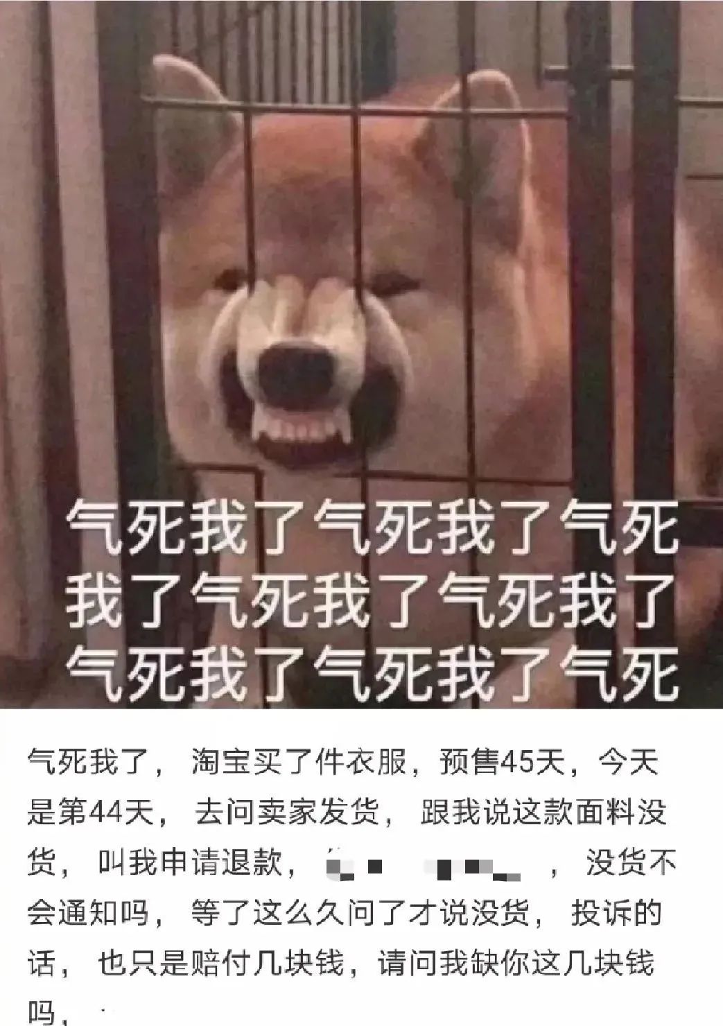 一消费者购买了一件需要等待45天的衣服,凭借对心仪商品的执念,终于辛辛苦苦等到了44天,终于可以“见到光明”的倒数第二天,询问了商家明天是否可以发货,得到的回复却让人十分气愤:“亲,这款面料没有货,您可以申请退款”。
