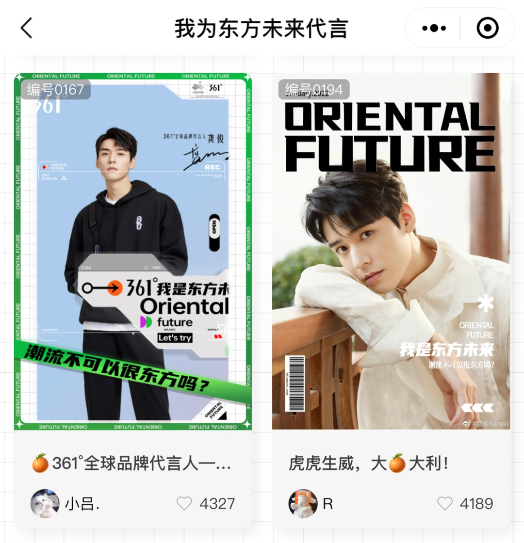 二是,在微信小程序,361°又发起了【我为东方未来代言】活动,用新颖的互动形式,契合年轻群体的应援需求。