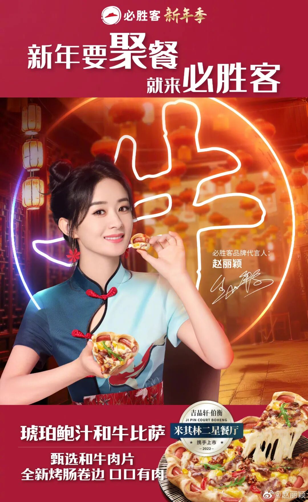 在宣传上,必胜客邀请赵丽颖为新品体验官,通过明星的影响力和信任,增强扩大联名产品的宣传力,撬动粉丝圈层,增强品牌新品及必胜客打造中国年宴的声量。