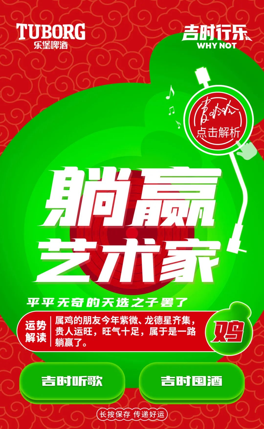 为了让消费者进一步提升参与感,吉时测运程,乐堡啤酒联手麦玲玲共同推出H5互动页面,用户可以自行选择生肖,测试生成个人专属的2022运势报告。借势人人关心的新年运势,通过易于参与又富有趣味的互动玩法,击破大众新年话题。