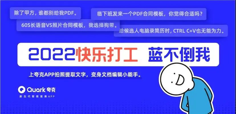 现实生活中总会遇到或多或少的难题,工作上的、学习上的。夸克就精准洞察到打工人的工作难题、学习党的备考难题、减肥党的健身难题,释出品牌短片,借用“蓝宝”这一经典IP形象,通过趣味的传唱方式深入沟通消费者,释出上夸克,难题“蓝不倒”的核心主张,帮助大家解决生活中所有的不愉快。
