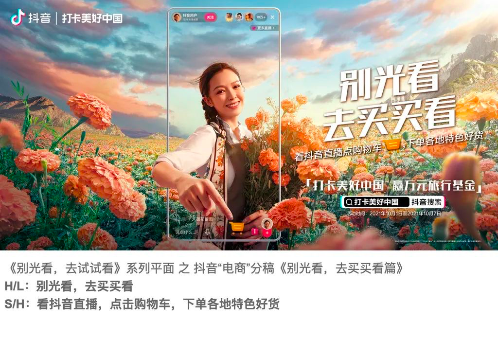 例如去年抖音国庆传播战役《在抖音,打卡美好中国》的文案:别光看,去试试看。