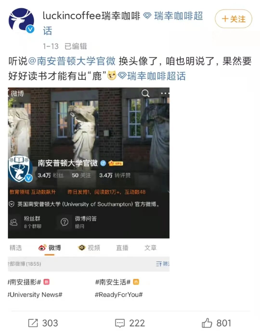 正所谓,官方玩梗最为致命。被反复cue后,瑞幸咖啡也亲自下场玩了一把谐音梗,调侃南安普顿大学:果然要好好读书,才能有出“鹿”。