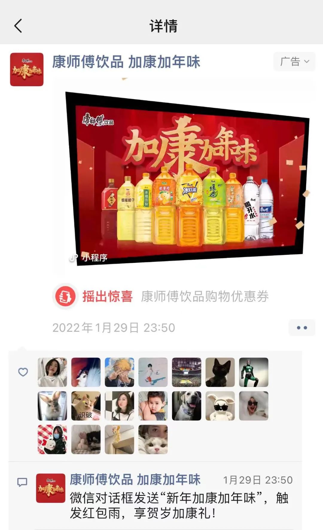 洞悉到这一点,康师傅饮品选择社媒最大流量切入口——微信,作为营销活动的主阵地,通过微信表情雨、朋友圈互动摇一摇、微信“年味集市”小程序调动参与者积极性,让“加康加年味”这个集自身品牌元素与春节传统社交习俗的大主题,更加立体地渗透到参与者内心。