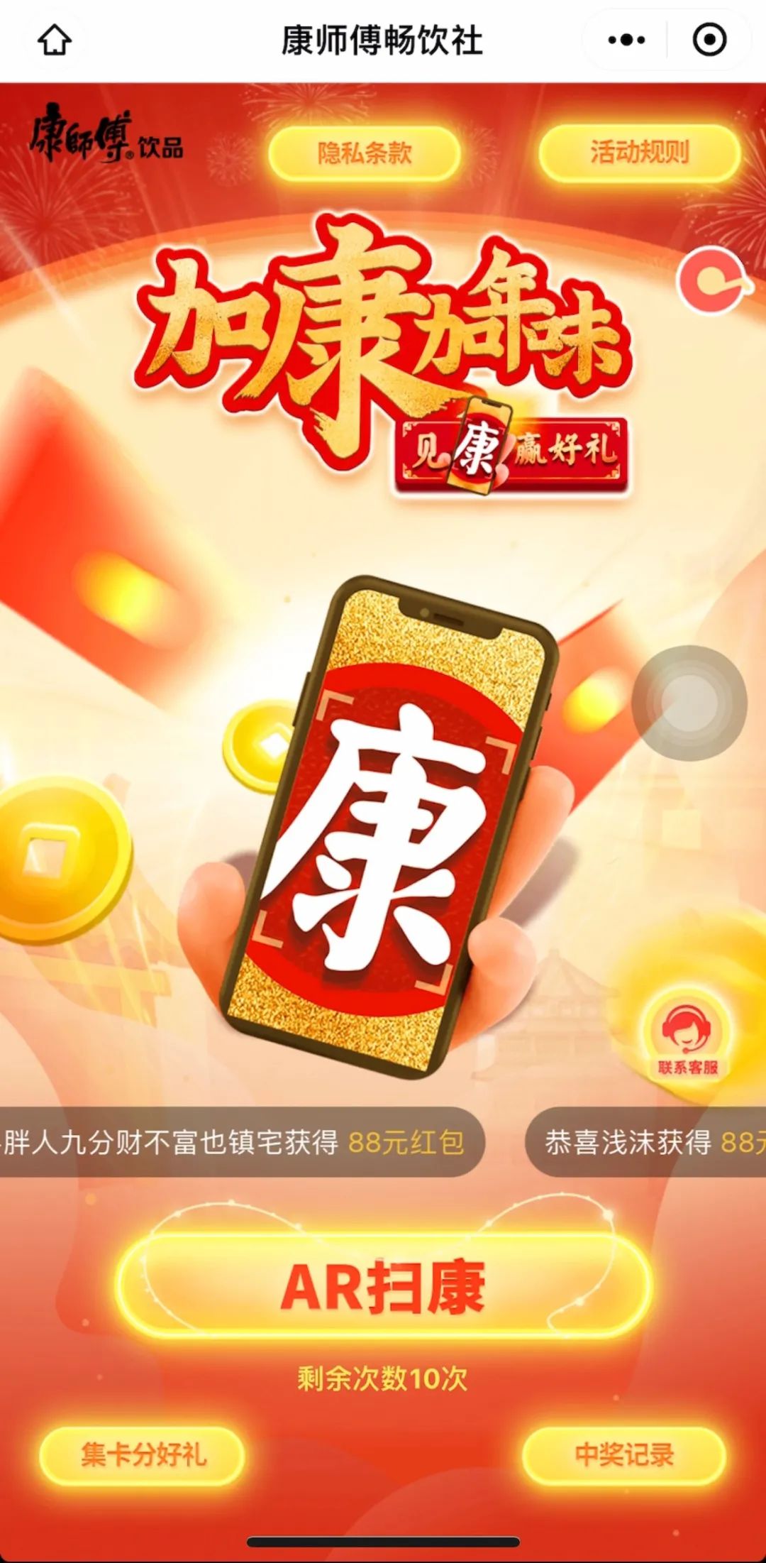 一方面,聚焦全民交互行为,线上围绕AR“见康赢好礼”率先开展贺岁迎新活动,引导大家通过AR扫描识别“康”字参与抽奖。