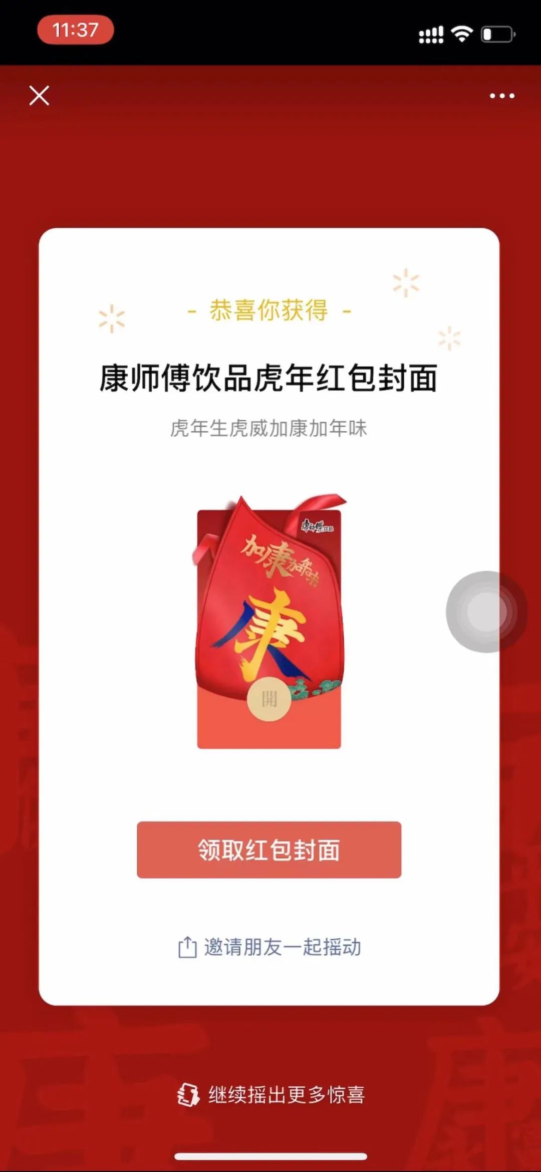 特别是在“微信表情雨”后续的抽奖环节,康师傅饮品借「“康”字异形红包封皮」传递祝福的同时,通过封皮中的隐藏彩蛋页,再度传播品牌TVC,同时引导大家前往体验“年味集市”小程序,环环相扣地帮助品牌在春节期间完成了营销闭环,沉淀品牌价值与口碑。