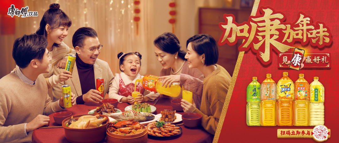 ——将“康”字背后阖家安康的美好祝福,与品牌本身建立正向联想,暗示在阖家团圆的生活场景中,康师傅饮品无时无刻都在陪伴国人,也是增添年味不可或缺的角色。