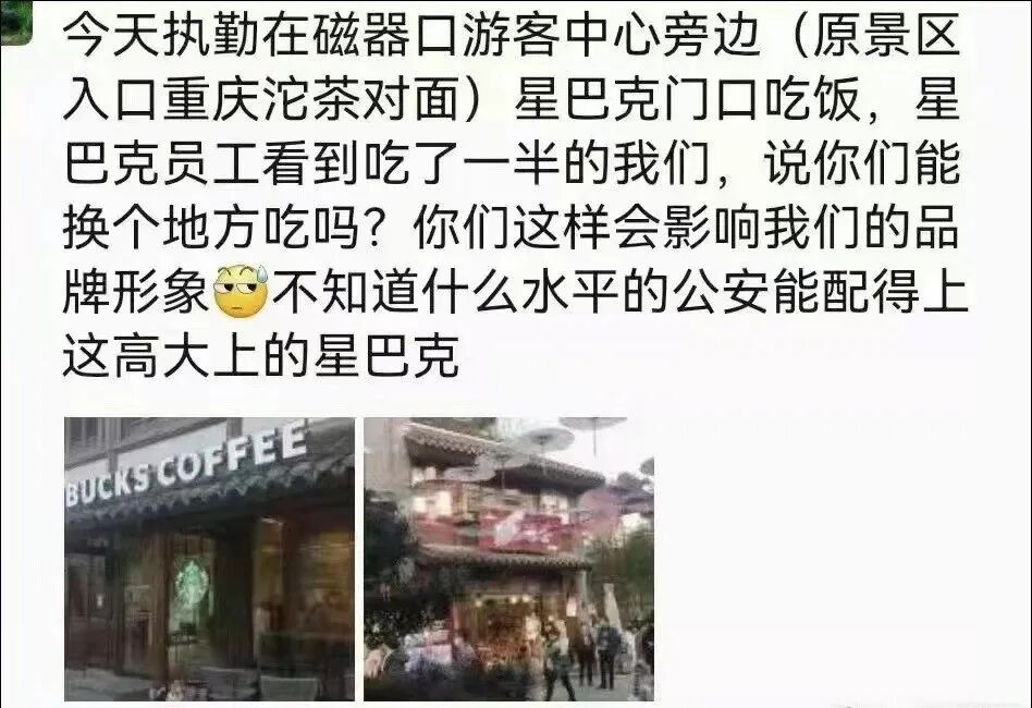 本来杨阳不想追这热点,毕竟大瓜都吃过一遍了,但是闲来无事翻了下微博,发现后续来了,前提回顾一下→简单来说,就是几个民jing,去星巴克门口借地方吃饭,结果星巴克员工说“影响品牌形象”,把民jing赶走不够,还把人给投诉了。