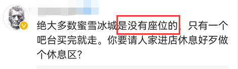 不过夸再多都是虚的,夸我就来买我,估计蜜雪冰城最想的是:一起来喝奶茶啊!只是在一片拍手叫好的呼声中,杨阳发现蜜雪冰城的营销,还是出现了“翻车”的迹象。有些门店只有站着买的份,就算有座位,掰着手指头都能数出来。进店休息会不会只是说说而已,最后让jing察蜀黎休息了个寂寞。