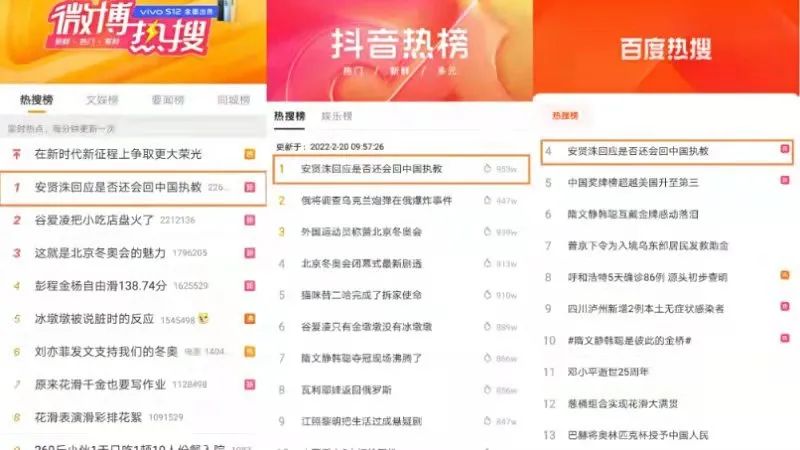 直播结束后,话题#安贤洙回应是否回中国执教#迅速登顶微博热搜第一位、阅读量2.6亿。此外,该话题也冲上了抖音热榜一位,百度热搜4位等多个全网热搜。