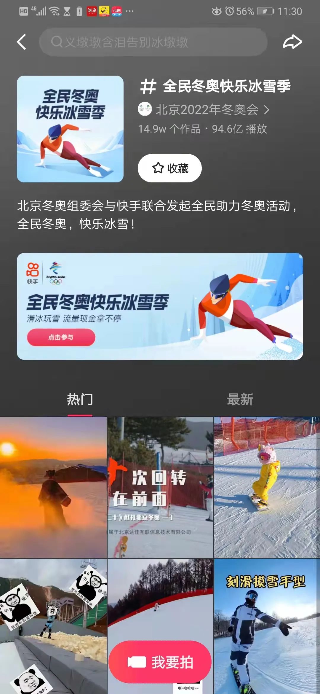 作为北京2022年冬奥会官方转播商,在预热期,快手就联合北京冬奥组委发起“全民冬奥快乐冰雪季”全民短视频挑战赛,通过形式多样的站内话题及活动,吸引了大批冬季项目爱好者及创作者参与,掀起快手站内冰雪运动热潮。数据显示,仅“全民冬奥快乐冰雪季”一项活动,就产生了14.9万个作品,总播放量高达94.1亿次。
