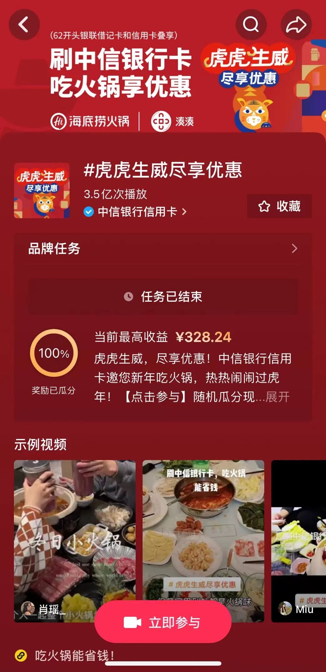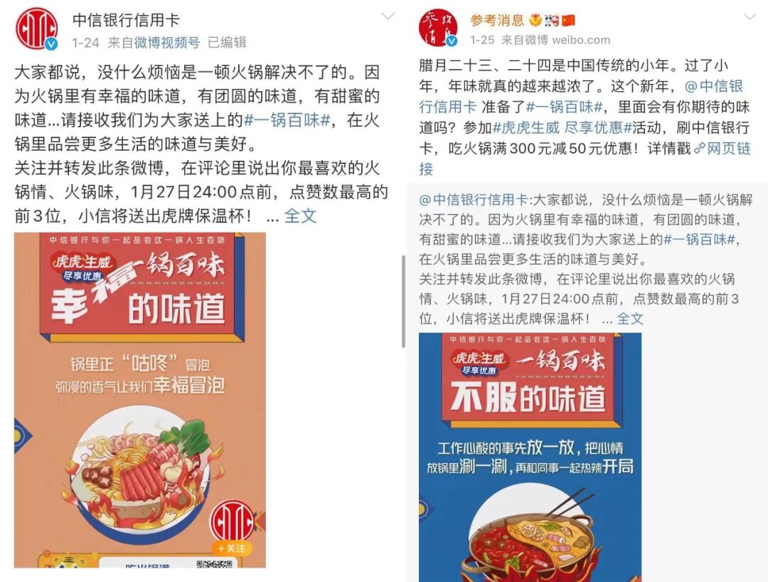 春节可谓是品牌都不会错过的热点,当下虽然元宵都已经过完,仍有不少品牌在延续着春节营销活动,借助余温持续发力。中信银行信用卡新春营销活动“虎虎生威”就是一个典型,不过在新春热点的基础上,“虎虎生威”有着更为巧妙的构思:以常规福利活动为基础,巧妙抓住新春时节用户火锅聚餐高频场景,通过线上线下联动的营销动作,渗透到用户多生活场景,紧紧抓住用户的胃和心,提升品牌形象,实现了新春营销开门红。01