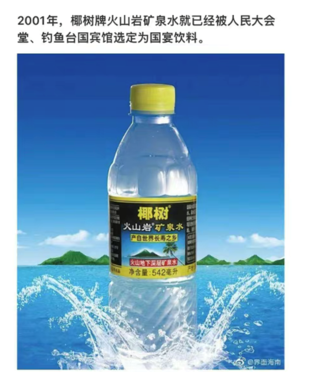但是人家的矿泉水,在2001年,就被人民大会堂、钓鱼台国宾馆选定为国宴饮料。