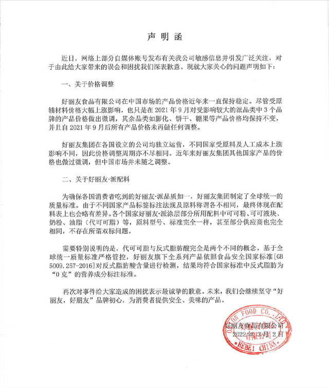首先代可可脂本身不健康,吃了不易消化和排出,二是成本低,仅为可可脂的1/10-1/6。面对全网抵制,好丽友深夜回应,表示不同国家成本受原料及人工成本上涨影响不同,价格调整周期亦不同,并表示涨价是去年9月的事了。