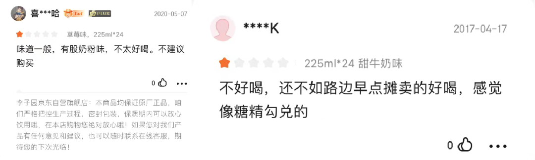 其实,消费者对李子园甜味牛奶饮料早已颇有微词。无论是社交媒体还是电商平台上,均存在部分消费者反馈李子园产品“一股奶粉味”、“像糖精勾兑的”。更有甚者,部分消费者在电商平台评论区反馈产品过期、存在质量问题等。对此,李子园未作重点提及,只是回应公司会与消费者和有关部门进行沟通处理。