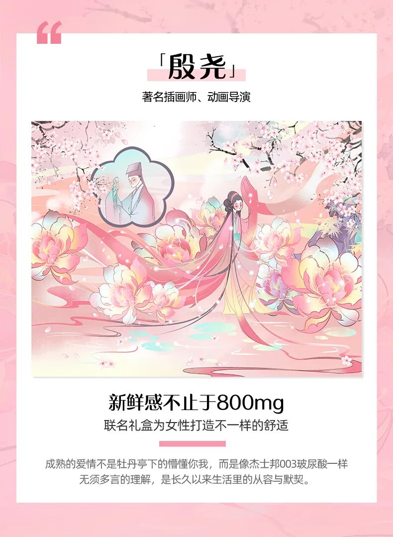 除此之外,礼盒中还别出心裁的放入了明信片作为小礼物。“她经济”盛行,而杰士邦很好的抓住了这个风口。哪怕是人到中年,这种花花绿绿的小周边对于女性消费者的吸引力依然不容小觑。有谁不爱好看的“小东西”呢?安全套作为功能性产品,很少会有品牌去考虑视觉方面的美感表达。但杰士邦显然不同。在线上,杰士邦联手站酷,邀请三位艺术家开启共创,凭借不同年龄阶段和不同经历女性艺术家对于爱情的感悟,创造出了这样一支深刻表达女性情绪的TVC,为广大女性发声的同时,用更直观的形式诠释出了杰士邦的品牌态度,同时在无形之中进一步增强了消费者对于杰士邦003玻尿酸的感知。将更多的艺术家气息赋予产品,不仅比其他品牌更能打动人心,同样这种关注女性消费群体的品牌态度也会培养起广大女性消费者的消费偏好,无形之中就扩大了市场。同时,借助艺术家的画笔将设计落地,推出设计师联名作品,打造出“产品创意诞生-目标人群覆盖-实物礼品售卖”这一系列完整的营销链路,将俘获的流量自然而然转化为客观的销量。同时也表明了杰士邦关爱女性、为女性发声并不只是说说而已。