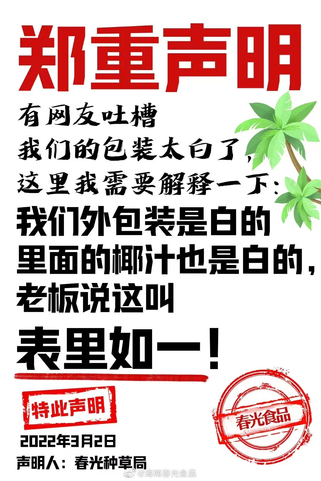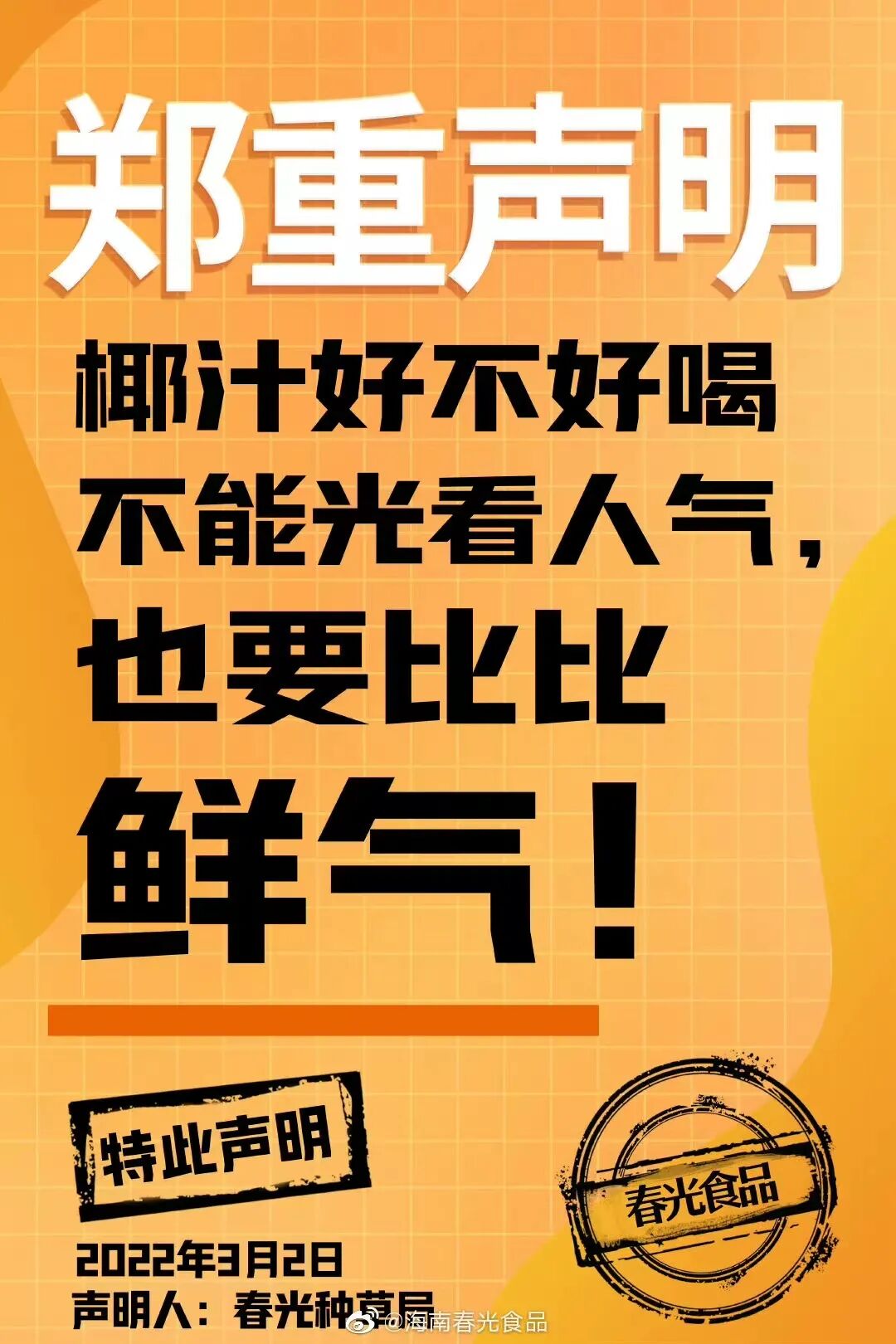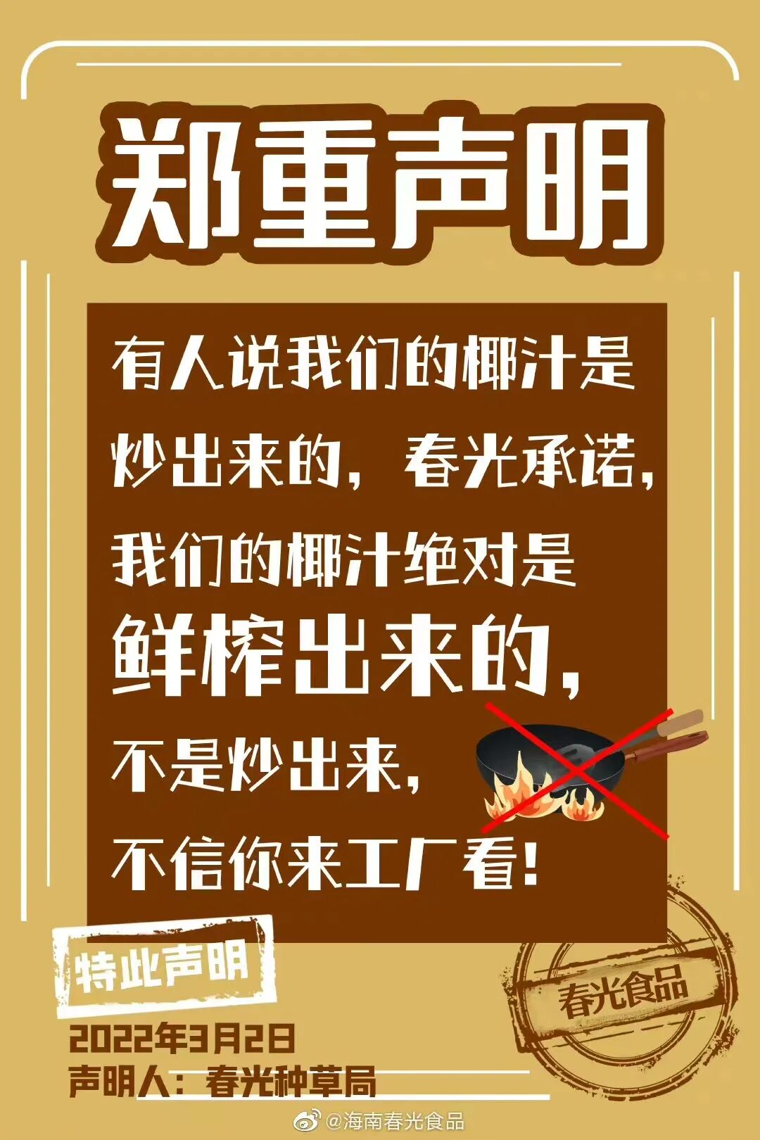 然后借吐槽内容,融入了产品卖点、品牌实力等关键信息点,消除用户反感情绪,最大化引发网友吃瓜的兴趣。“有人说,我们的椰汁是炒出来的,春光承诺,我们的椰汁绝对是鲜榨出来的,不是炒出来的,不信人来工厂看”....