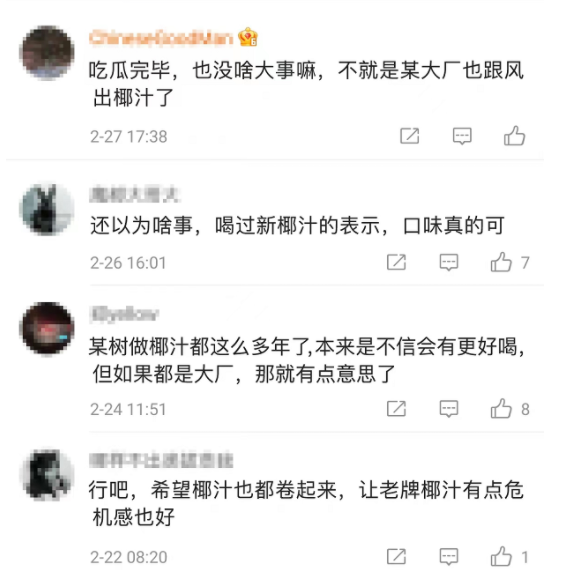 一方面借势椰树,赋于声明内容热点属性,掀起舆论争议,最大化吸引眼球,引发网友大规模自发传播,这一点可从评论中看出。另一方面,绑定椰树熟悉的广告文案,提升用户对内容熟悉感,大大降低营销认知成本。02